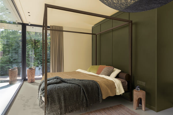 Gebruik de natuurlijk tinten van 'Green Wave' in de slaapkamer. Rustige, in de natuur voorkomende kleuren die perfect samengaan en het warme gevoel versterken.
