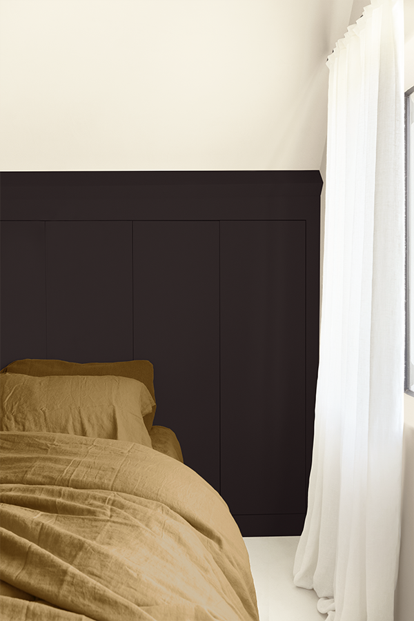 Kies voor een gebalanceerde kleurencombinatie in de slaapkamer met een neutraal off-white en zwart accentkleur.