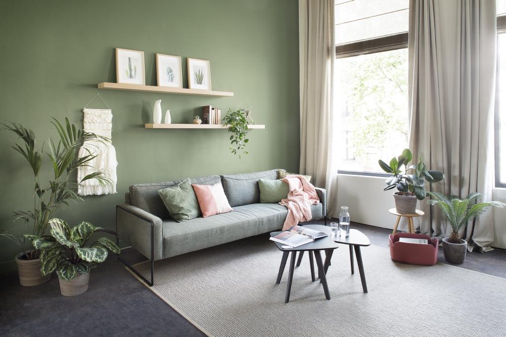 Plaats je het accent op je muur achter een zetel, dan beleef je de kleur wanneer je in de ruimte rondloopt. Eens in de zetel zit het accent achter je en krijg je een veilig gevoel. Wil je de kleur maximaal beleven vanuit je zetel? Plaats dan het accent op je wand er tegenover.