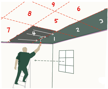 Overlap het volgende vlak met ongeveer één rolbreedte en ga verder. Schilder vierkant na vierkant en geef zo ononderbroken het hele plafond een grondlaag. Laat de verf goed uitdrogen.