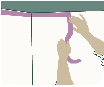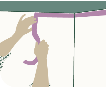 Plak de randen op de muur af met brede afplaktape op enkele millimeters van het plafond. Gebruik een ronde kwast om de randen te schilderen en strijk de verf goed uit langsheen de scheidingslijn.